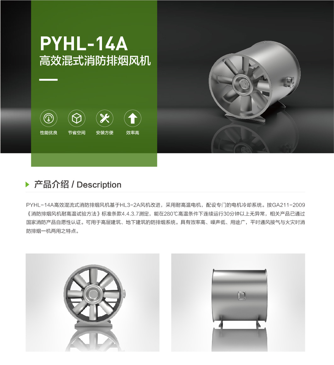 PYHL-14A高效混流式消防排烟风机基于HL3-2A风机改进,采用耐高温电机,配设专门的电机冷却系统。能在280℃高温条件下连续运行30分钟以上无异常,相关产品已通过国家消防产品自愿性认证。可用于高层建筑、地下建筑的防排烟系统。具有效率高、噪声低、用途广,平时通风接气与火灾时消防排烟一机两用之特点。