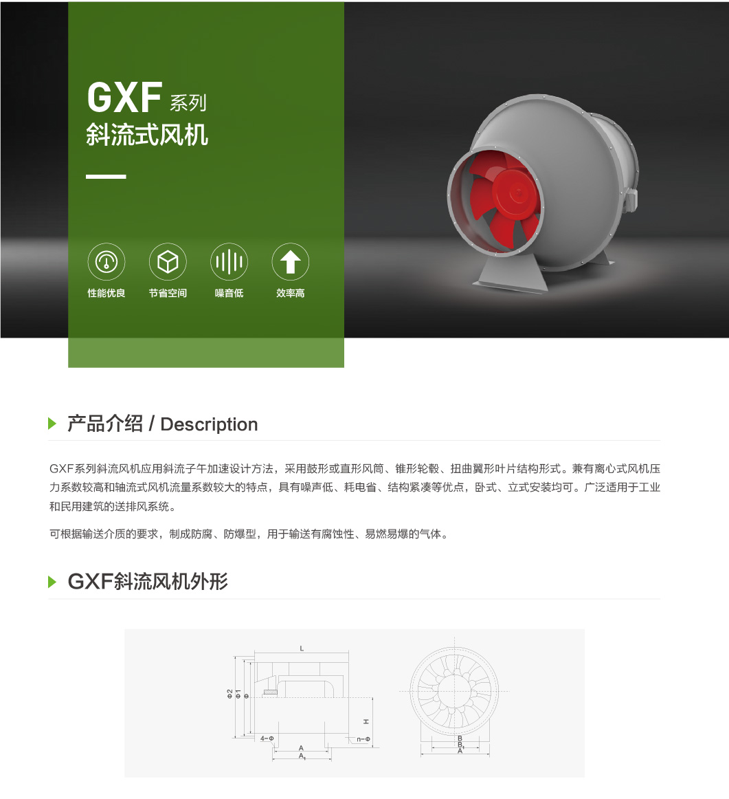 GXF系列斜流风机应用斜流子午加速设计方法,采用鼓形或直形风筒、锥形轮毂、扭曲翼形叶片结构形式。兼有离心式风机压力系数较高和轴流式风机流量系数较大的特点,具有噪声低、耗电省、结构紧凑等优点,卧式、立式安装均可。广泛适用于工业和民用建筑的送排风系统。