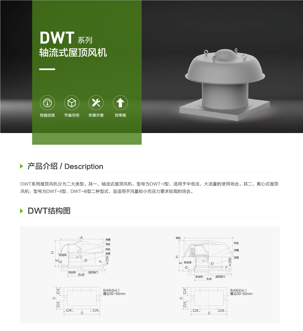 DWT系列屋顶风机分为二大类型。其一,轴流式屋顶风机:型号为DWT-l型,适用于中低压,大流量的使用场合。其二,离心式屋顶风机:型号为DWT-ll型、DWT-lll型二种型式,宜适用于风量较小而压力要求较高的场合。