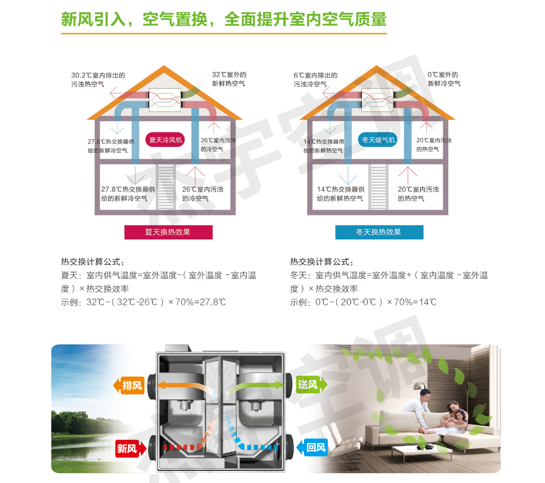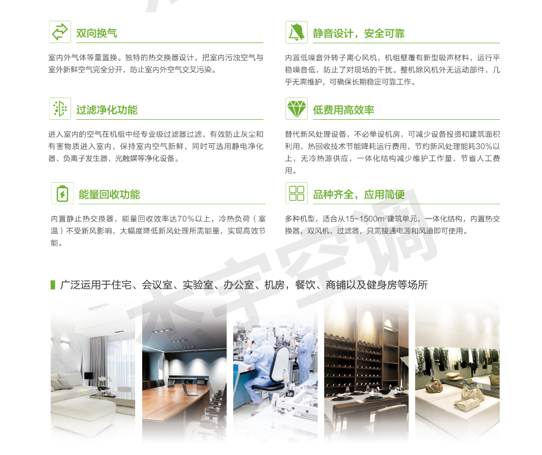 双向换气,室内外气体等量置换。独特的热交换器设计,把室内污浊空气与室外新鲜空完全分开,防止室内外空气交叉污染; 静音设计,安全可靠,内置低噪音外转子离心风机,机组璧覆有新型吸声材料,运行平稳噪音低,防止了对现场的干扰。整机除风机外无运动部件,几乎无需维护,可确保长期稳定可靠工作。